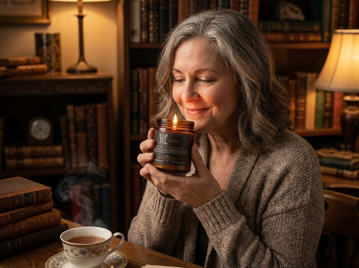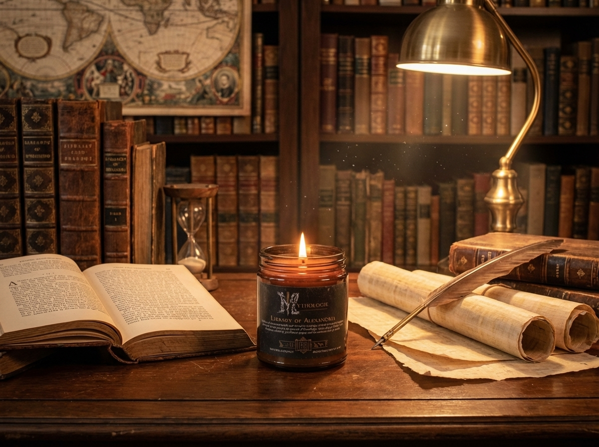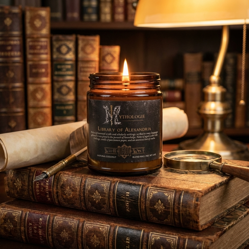 Scent notes: Aged leather book bindings, scrolls of parchment paper, and an ominous hint of smoke.