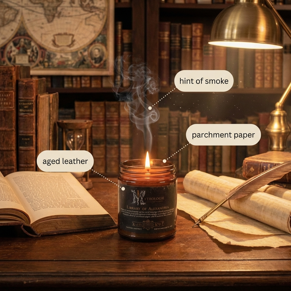 Scent notes: Aged leather book bindings, scrolls of parchment paper, and an ominous hint of smoke.